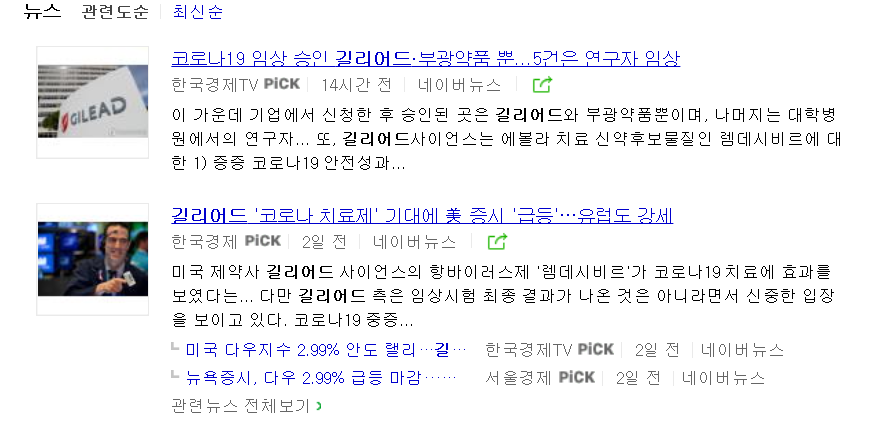 뉴스에서는 이런 치료제들이 돌아가면서 이목을 끌고 있는데, 제가 볼때는 주식 시장을 위한 순환적인 이목끌기용 뉴스가 아닌가 생각합니다. 실질적으로 치료제로서 무엇인가 역할을 할 수 있는 약이 나오려면 결국 빨라야 5월 말 이후가 될 것이고, 신약이 개발되려면 몇 년은 기다려야 할 것으로 보입니다.