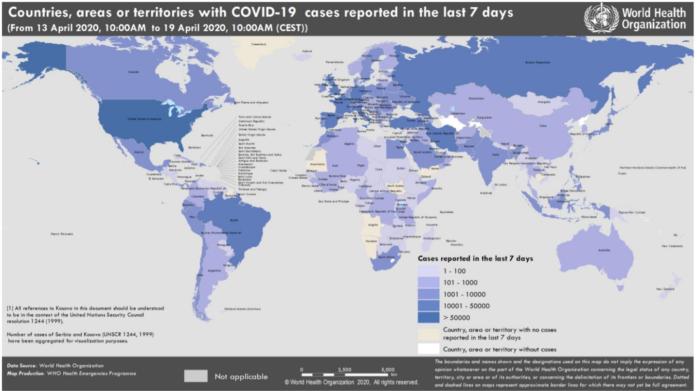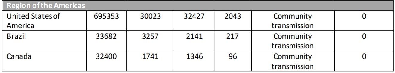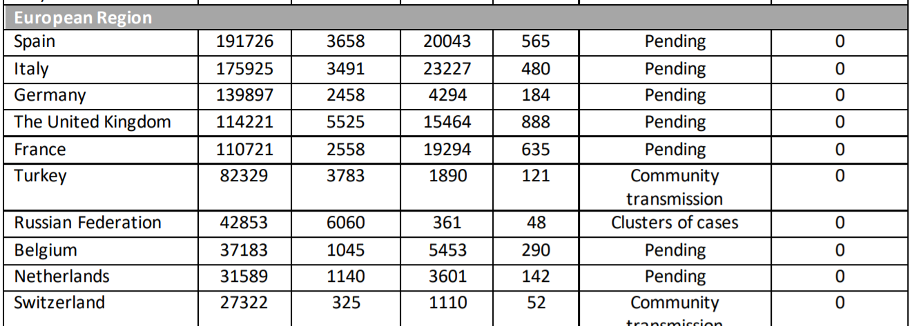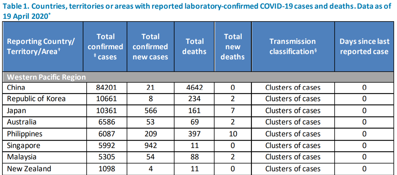 먼저 현지시간 4월 19일 기준, WHO 보고서에서 주요 국가의 누적 환자, 새로 발생한 환자, 사망자 표는 아래와 같습니다. 동남아에서는 싱가포르와 일본이 급격히 늘어나고 있고, 유럽과 미국은 여전히 높은 전염률을 보이고 있습니다.