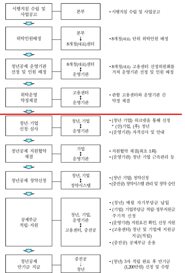 청년내일채움공제 사업의 진행과정은 하기와 같습니다. 저희가 보아야 할 부분은 빨간 선 바로 밑에 부터 보시면 됩니다. 개인과 기업이 자격심사를 거친 후 청약시스템 관리 및 청약 승인을 받아야합니다. 그 후 각 개인과 기업은 매 월 정해진 금액을 부담하고, 만기가 되면 만기금 신청 및 수령의 과정을 거치게 됩니다.