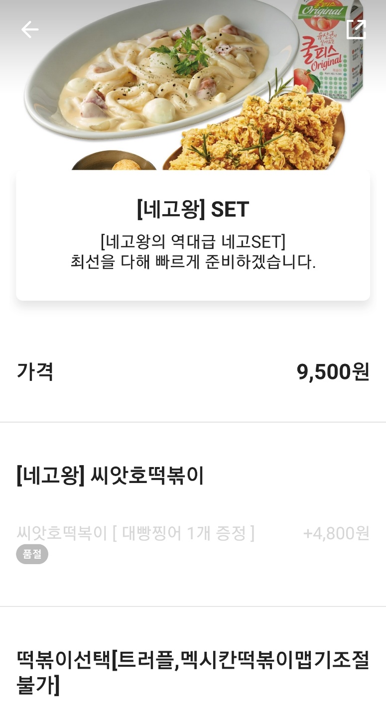 배민앱에 떡참 메뉴를 보면 하기에 보시는 것처럼 [네고왕SET] 메뉴를 클릭하시고 주문하시면 됩니다. 굳이 혼란스러울 것도 없을 것 같습니다.