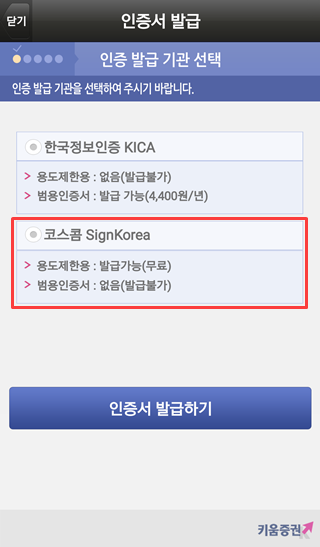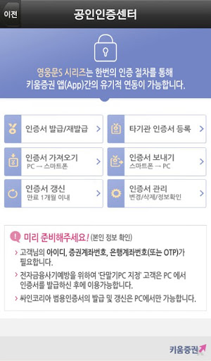 계좌개설을 하셨다면 HTS 또는 아래와 같이 MTS에서 로그인 시 나오는 공인인증센터에 들어가셔서 증권 인증서를 발급 받으신 후 프로그램에 접속하셔서 연동된 계좌로 증권 계좌에 입금 하시고 맘에 드는 주식을 매수하시면 되겠습니다.