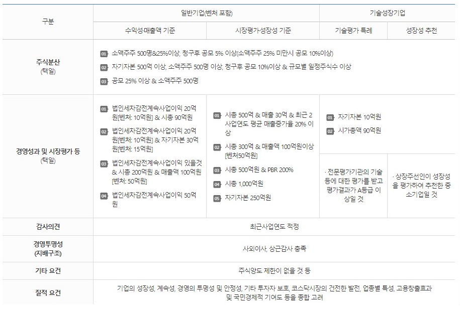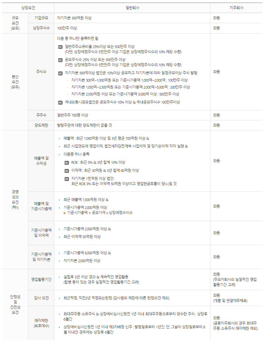그것은 아닙니다. 초기의 주식회사를 설립하면 앞서 말한 것처럼 회사의 자본금만큼 소수의 주식을 발행하여 초기 주주들이 나누어 가집니다. 이러한 상태에서 아래 표와 같이 각 시장에 맞는 조건을 충족시킨 후 코스닥 혹은 코스피 시장에 상장절차를 밟아야 합니다.