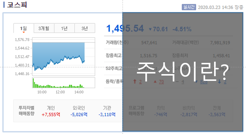 특히 요즘은 코로나 바이러스로 인한 증권시장의 급락으로 많은 사람들이 기회를 엿보고 있는에 많은 관심이 쏠리는 시기이기도 하죠. 이 기회를 빌어 간단히라도 주식에 대해 알아보고자 합니다.